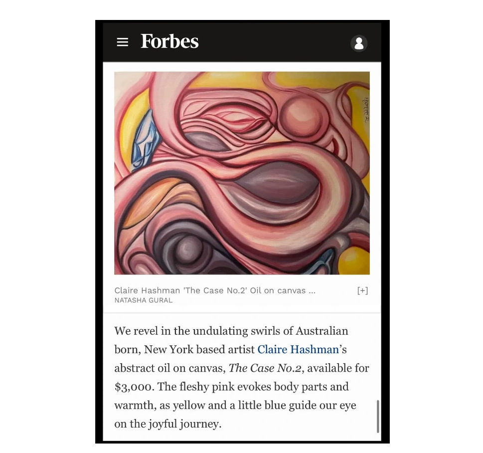 In 2023, Claire’s work was reviewed by Natasha Gural in Forbes, and in 2024 she was included in Bleucalf Magazine. See below for links to the magazines.